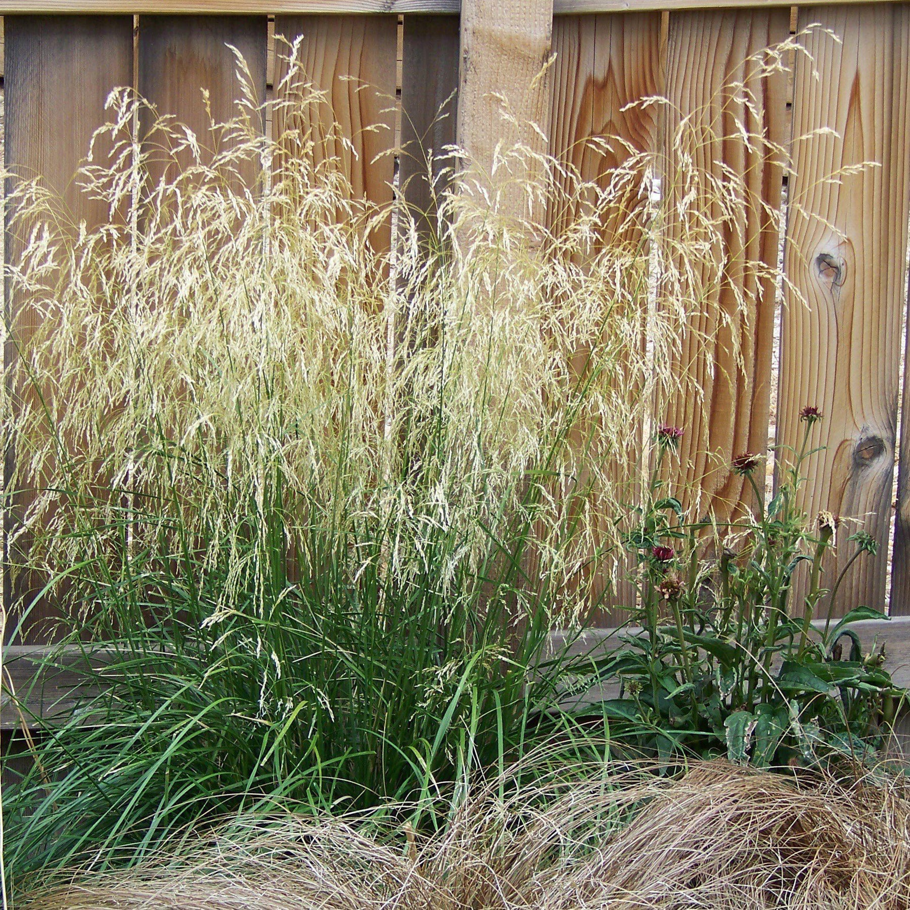 Karl Foerster's Feather Reed Grass is a visually stunning ornamental grass that is a soft green. It has feathery stalks that emerge a reddish-brown in spring and turn a beautiful golden yellow in fall. These feathery stalks bloom weeks earlier than most Feather Reed Grasses and continue to bloom until fall. Prefers sunny areas in rich moist soils.