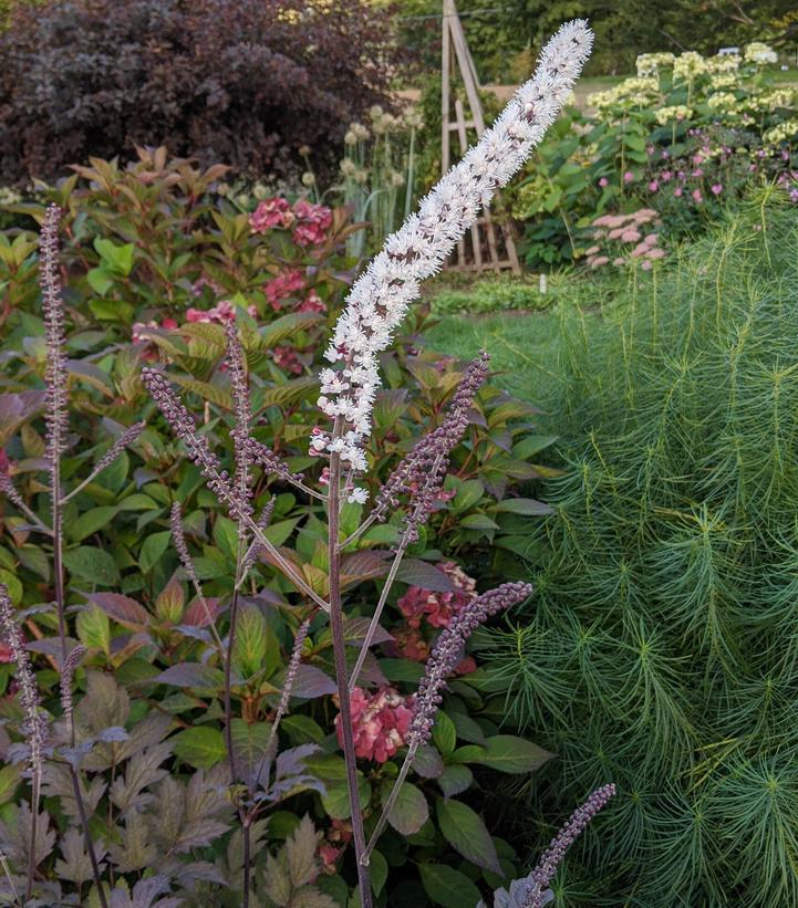 The deep purple, bronze foliage is almost black and offers great contrast in the mixed garden bed. Fragrant pinkish white spikes bloom August through October. Unique and incredible color in the shade garden!