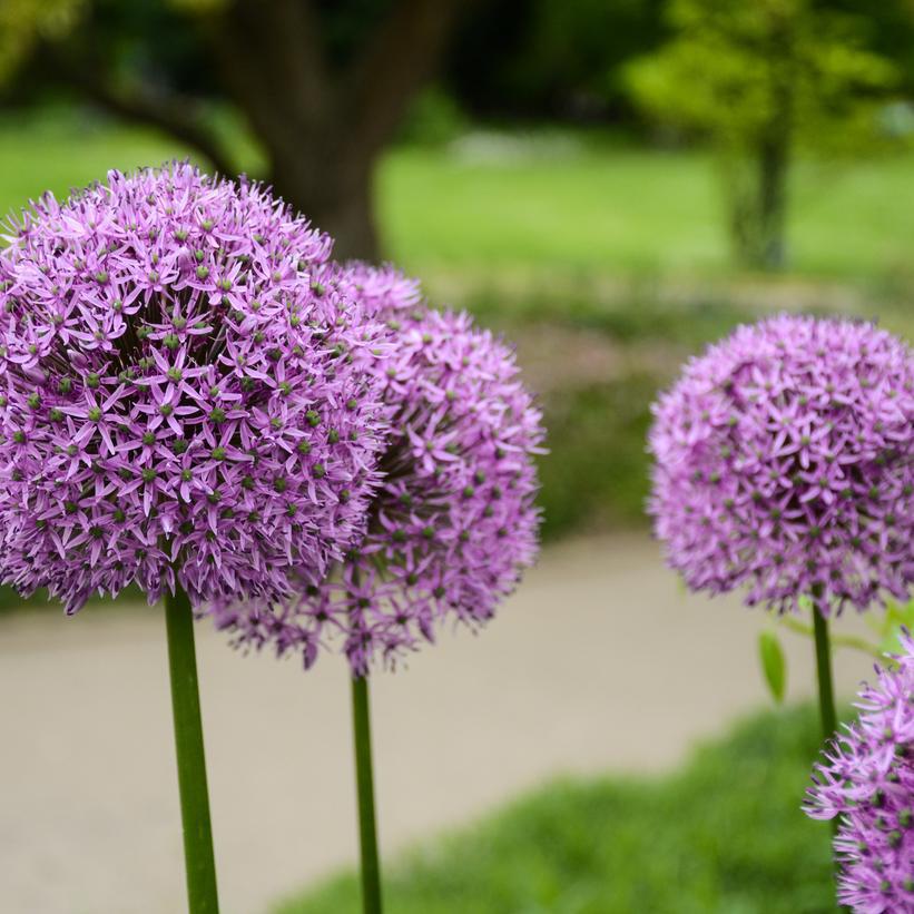 Fleshy, strap-like foliage forms a mound that gives rise to a thick stalk bearing a sphere of buds in May. By mid to late May buds open to form a beefy circle of lavender bloom that lords above the foliage. Unique, showy and easy to grow!