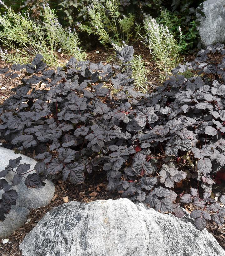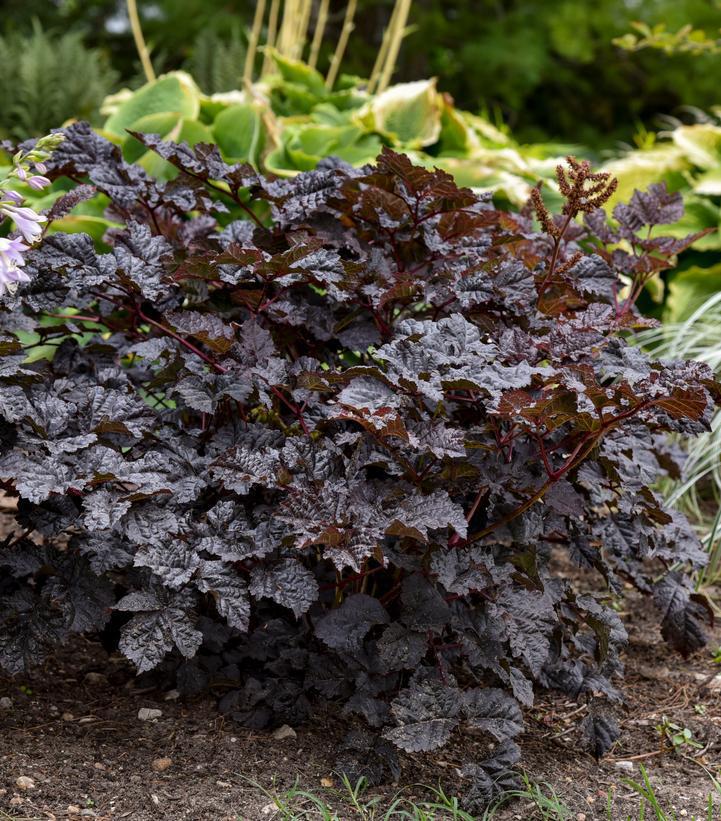 'Dark Side of the Moon' is the only dark leafed Astilbe with purple flowers that's on the market. Rich deep chocolate burgundy leaves form an incredibly attractive mound of foliage. Emerging leaves are yellow with a dark margin with a glossy sheen that become completely dark as they age. Dark stems hold raspberry buds that burst forth with rosy purple flowers. This performs best both for growing and flowering in full sun in the north with adequate moisture, but also grows in shade.