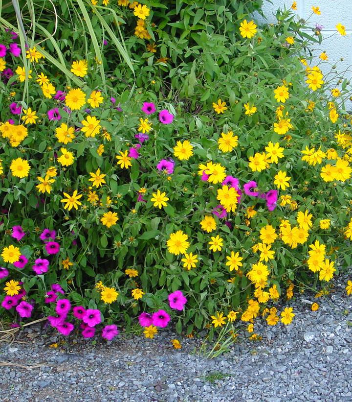 This powerhouse bloomer flowers from early summer into October covering its soft green foliage and rounded, spreading form with masses of yellow-orange color. Neither heat or mildew seems to phase this performer that loves to be grouped and always has a flock of butterflies nearby.