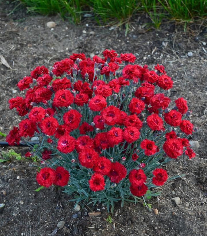 This colorful perennial produces fragrant, double, hot cherry red blossoms atop a low mound of silvery blue, spiky foliage. Use it to edge sunny borders and pathways.