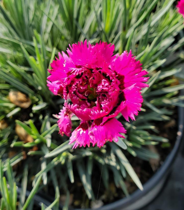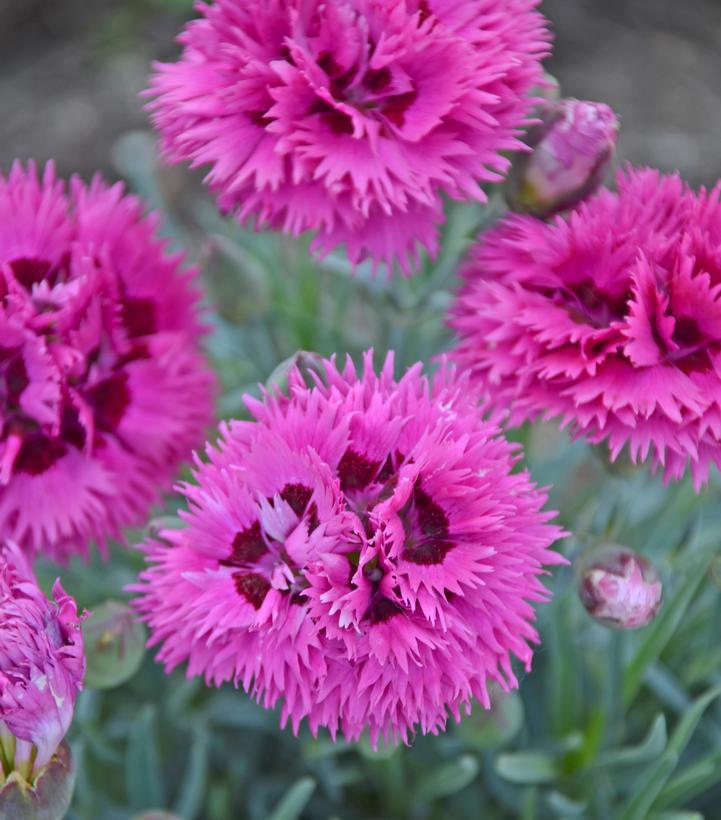 This colorful perennial produces loads of double, vibrant fuchsia pink flowers with a deep red eye and heavily serrated edges atop a low mound of steel blue foliage. Use it to edge sunny borders and pathways.