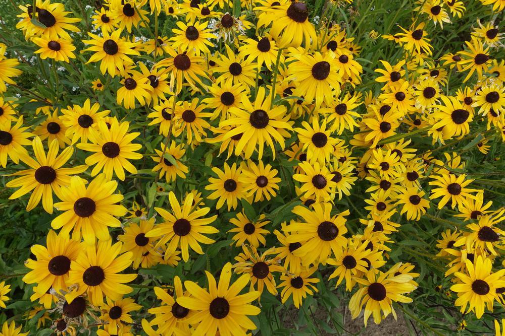 A double layer of overlapping, horizontally held yellow petals and a dark cone will "catch your eye" from mid-summer into the fall. Lush dark green foliage, excellent basal branching, and compact form are ideal for the sunny mixed perennial bed.