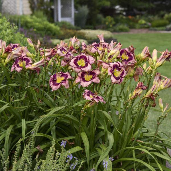 This daylily is perfect for the summer garden. 5” pastel pink flowers have a very wide, wine purple eye and a matching purple petal edge.