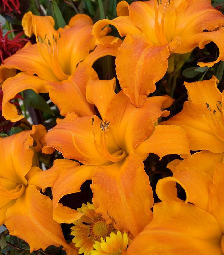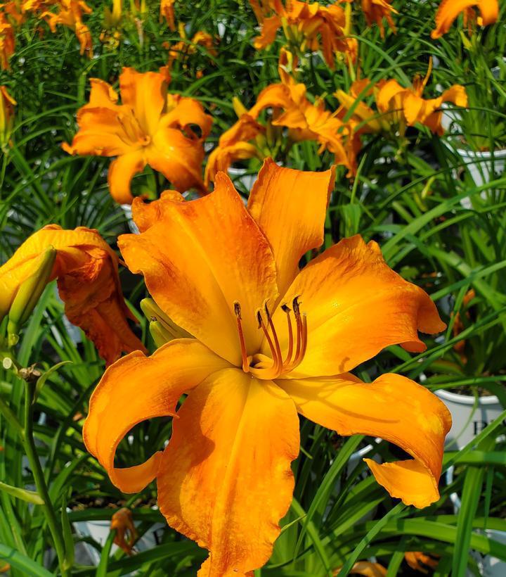 Nothing comes close to the spectacular 7.5-8.5", glimmering tangerine orange, gold dusted blossoms and green throat of this selection. Officially classified as "unusual form", the tepals are narrow, twisted, and re-curved with loosely ruffled edges. These gigantic blossoms open in late July and August on tall scapes above the attractive arching foliage. With such a mammoth bloom and unique look, this selection will shine in your garden whether planted alone or in groups in the middle of any perennial garden.