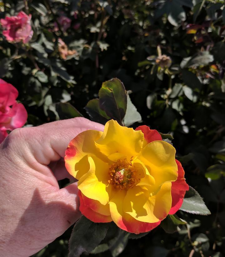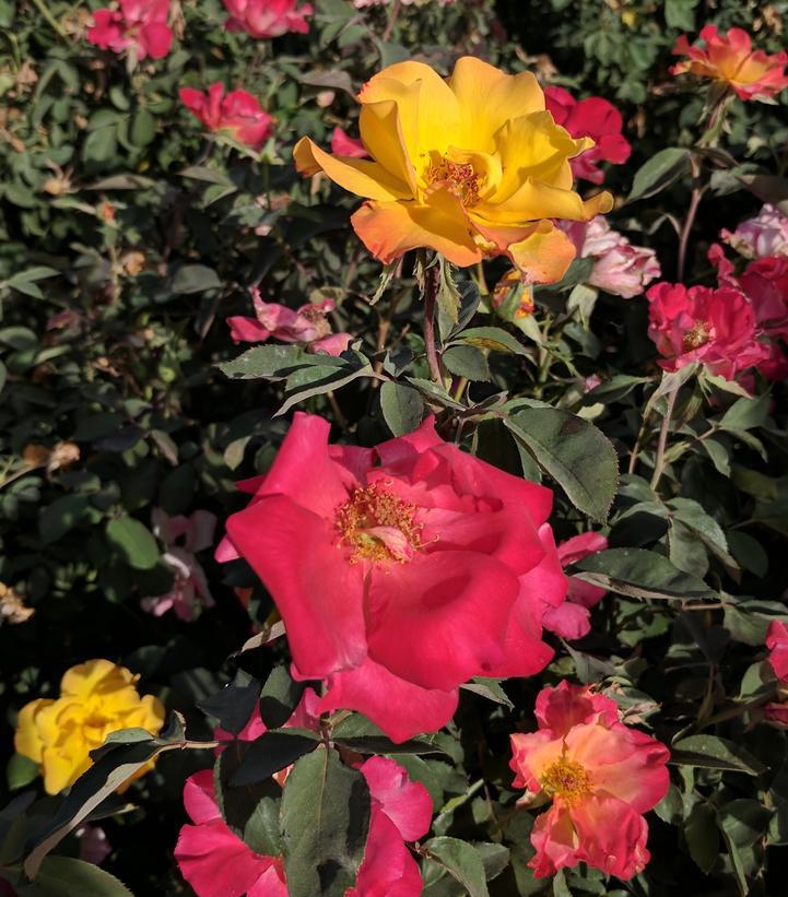 Sure to brighten up any garden, this rose produces a large volume of flowers full of yellow and bright orange. It is easy to care for and attracts butterflies and pollinators.