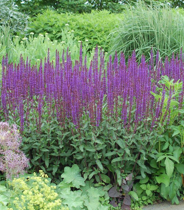 A strong bloomer, 'Caradonna' features a bevy of violet-purple flowers starting in June. These flowers are strung along a multitude of spikes held above fragrant foliage made even more attractive by the glowing purple color of the spikes and stems themselves lending a color intensity that makes this plant even more of an attention getter.