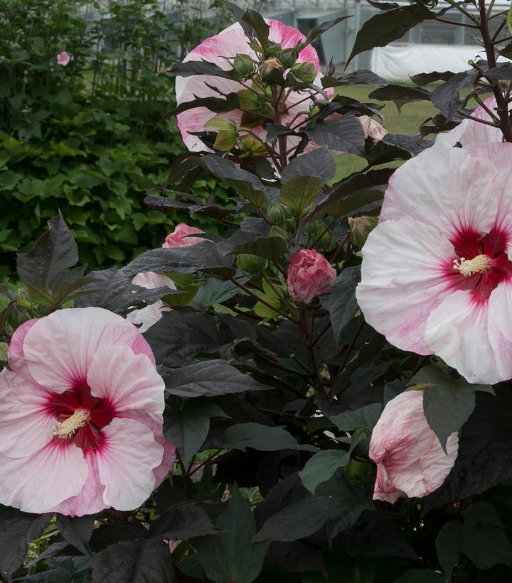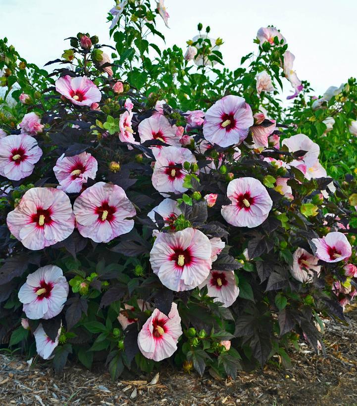 A naturally compact selection that works well in large containers. Large 7-8”, white flowers with a red eye are produced all over the dense, rounded clump of deep black-purple maple-like leaves.