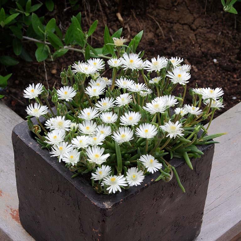 Aggressive, spreading and so easy to grow, this carefree succulent will thrive in hot, sandy, droughty soils with the added bonus of flowering like crazy from spring through early fall. Those flowers are thrillers sporting loads of pure white, thin petals around a yellow stamened center all backed by deep green foliage.
