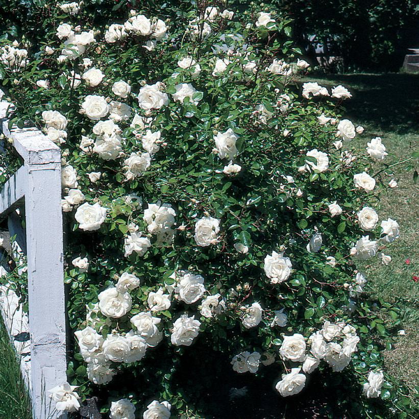 An old timer that just keeps performing. You'll love the profusion of medium size, double white flowers produced thoughout the growing season by this tough, aggressive grower. Deep green, lustrous, disease resistant foliage serves as a great backdrop for bloom bunches that are produced on both new and old wood.
