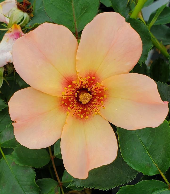 Named the Royal Horticulture Society Rose of the Year in 2015, Ringo All-Star rose features single flowers with a unique color blend of melon-orange and pink that age to lavender for a multi-colored effect. A distinctive cherry-red eye and sunny yellow stamens make the blooms even more intriguing. Developed by Chris Warner of the UK.
