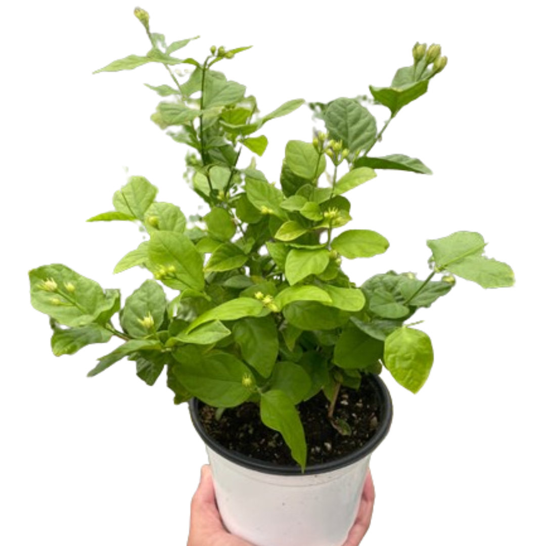 • Description: Jasminum sambac, a tropical evergreen shrub or vine that can grow up to 9.8 ft tall and wide. It has glossy dark green leaves that are arranged in whorls, with opposite pairs of leaves.