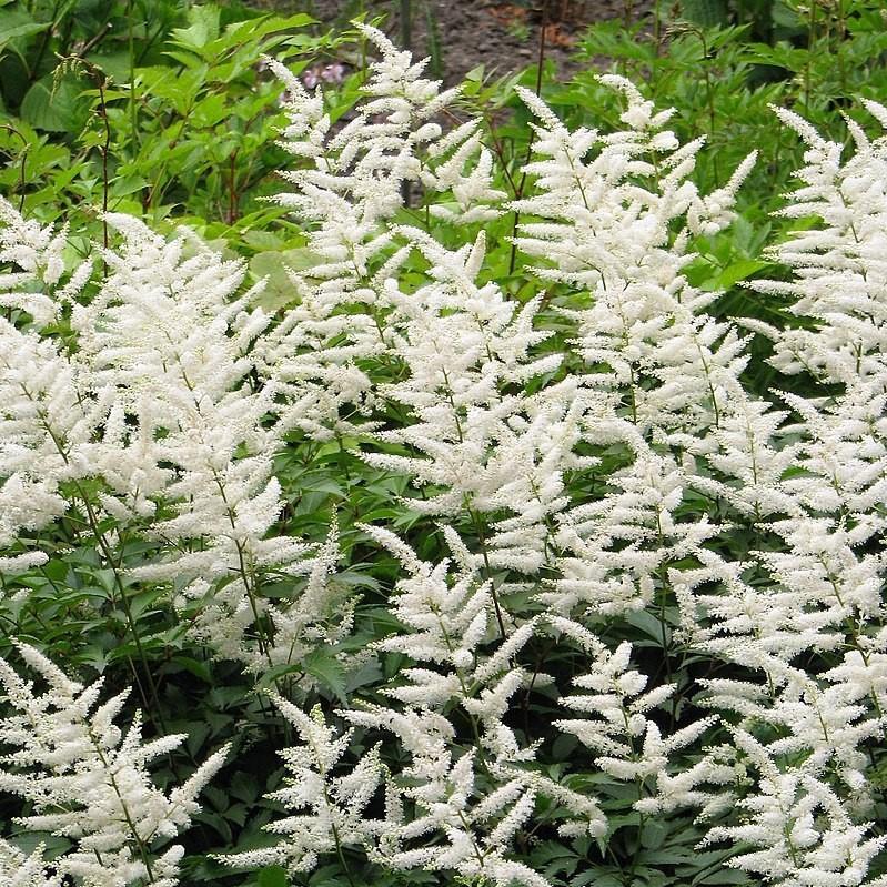 Deutschland Japanese Astilbe is a mounding herbaceous perennial with deeply divided dark green fern-like foliage. Upright triangular panicles of pure white flowers create feathery tufts above the leaves in late spring into summer. Flowers best in part shade and rich, moist soils. Astilbe are deer and rabbit resistant.