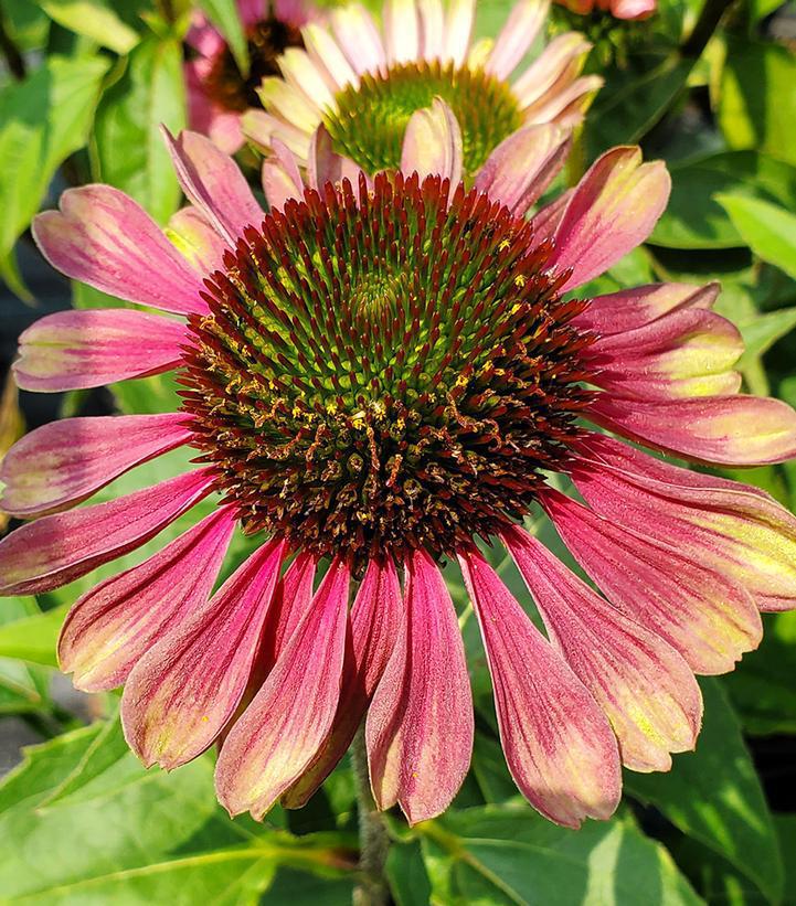 ‘Green Twister’ has lemon-lime petals that transition to a light pink or carmine red near the center cone. A robust plant with strong stems to hold the flowers upright when they bloom in mid-summer to fall. Stems lengthen after the first year and make excellent cut flowers. This plant is a natural mutation of ‘Magnus’, it is not a hybrid and therefore overwinters better than many modern hybrids. Coneflowers are well known for attracting butterflies and other pollinators and the seeds are relished by birds in the autumn. Drought resistant once established and easy to grow in sun and light shade.