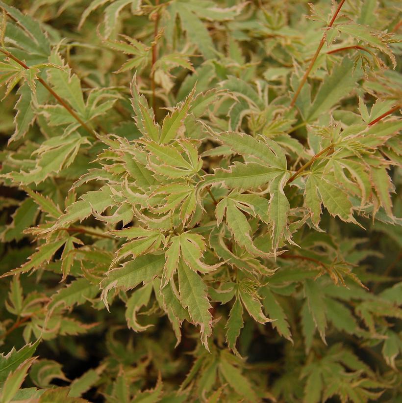 ‘Butterfly’ has been around for a long time, but is still one of the most underused Japanese Maples and one of the best for giving you outstanding bang for the buck. One look at its incredible foliage will have you hooked right from the start as its emerging foliage is spectacular in the spring with pink margins surrounding deeply cut, small delicate leaves that mature as spring progresses to a soft blue-green shade with a cream colored, pink tinged variegated edge. This color, along with the texture and the fact that the mature leaves curl, give ‘Butterfly’ a unique and very attractive look that you’ll love. ‘Butterfly’ is one of the slowest growing, smallest scale Japanese Maples with its upright, vase shape being perfect for smaller spaces in sun or partial shade.
