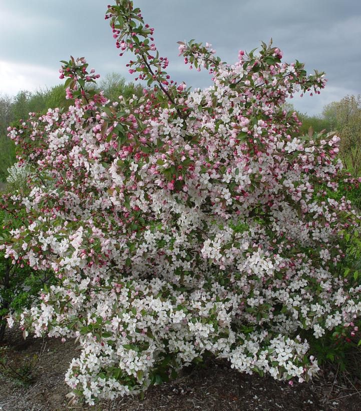 Low, dense, and spreading, this crabapple selection looks like a low, fluffy cloud on the horizon when in bloom as profuse, single red buds open to an overwhelming display of fragrant white flowers in early May. Loaded with small, bird-attracting red fruit, this plant is at home as a specimen or grouped to form a low, wide tree break in the landscape.