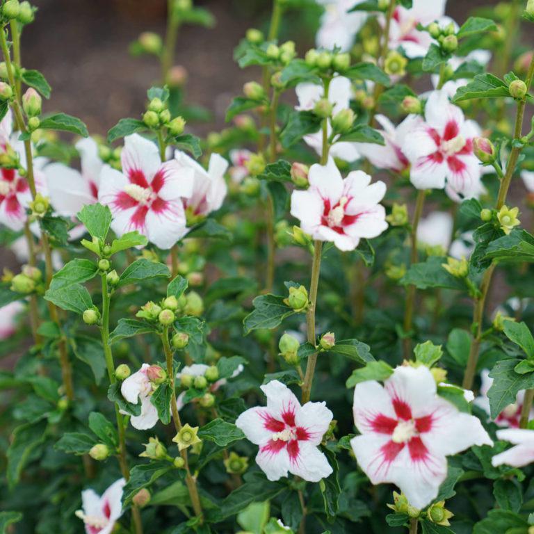 Another plant breakthrough from Proven Winners®/Color Choice®, 'L'il Kim'® is the first dwarf variety of Rose of Sharon on the market opening up loads of landscape possibilities that weren't available previously given the 8-10' sizing of all others in this species. 'L'il Kim'® is less than half the size meaning it will fit in small spaces or along the foundation without overpowering the area. Just because it's small, don't think that 'L'il Kim'® is a wimp when it comes to blooming! Starting in mid July, big, beefy buds begin to open to reveal 2" diameter, star shaped, pure white flowers with a stunning deep red center. The bloom is heavy, lasts into early September and the individual flowers last up to 3 days, 3 times longer than those on any other Hibiscus!! Even its foliage is better than its larger brethren showing better thickness and much deeper color than others. You'll want to plant more than one 'L'il Kim'® and why not with its easy care nature and its ability to thrive in full or half day sun.