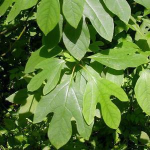 Sassafras trees are valued for their fragrant spring blooms that attract butterflies. It is also a host plant for a variety of butterflies. Bright green foliage adorns the interesting, horizontal branches and turns a striking yellow, orange and red in the fall. Female flowers produce dark blue fruits held on red stalks that are relished by birds.  Trees can sucker but if a single stem is desired suckers are easily mowed. Sassafras has been cultivated since the early 1600’s for it’s use as food, medicine and for building.