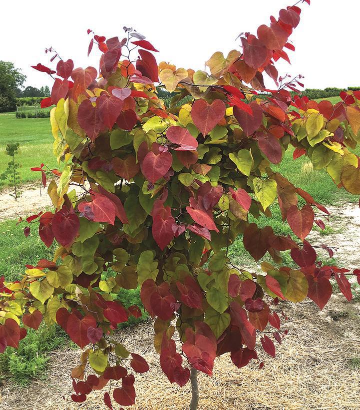 This Cercis has pink flowers that are followed by unique foliage, emerging burgundy-red, followed by bright yellow and green as it ages. The color display is persistent throughout the season, often showing four to five different shades on a single branch. Developed by the JC Raulston Arboretum at NC State University.